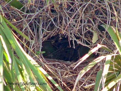 The nests are quite different from those with which we are normally accustomed. They have front and side entrances rather than the top where we usually see birds nesting. They are also quite large. See NEST. Also, to get a better idea of how small these birds actually are check out PALM TREE with parrot.