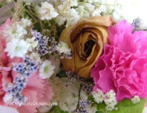 As a postscript - I just checked the arrangement again. All white and pink, I suspect they were white roses. Yellow would not have fit.