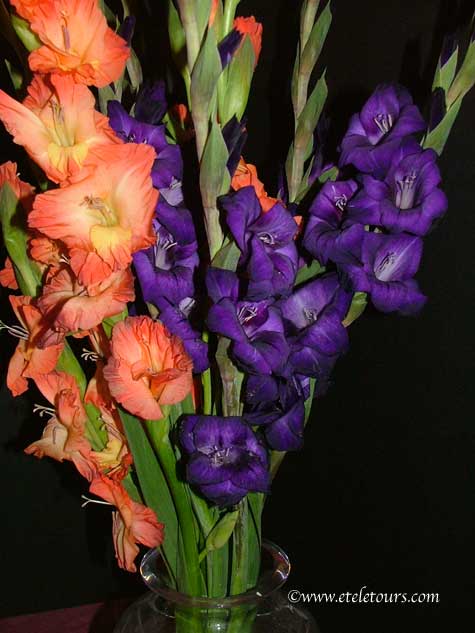 The flowers and buds along the stalks that first caught my eye were deep purple in color. I thought they would be a great choice for all you "purple lovers." Then the orange caught my eye for the slight variation in petals and their delicacy. Once at home, I photographed the two colors together and though I liked one of the arrangements (see Gladiola Mixture), today's photo won out for being the featured one.