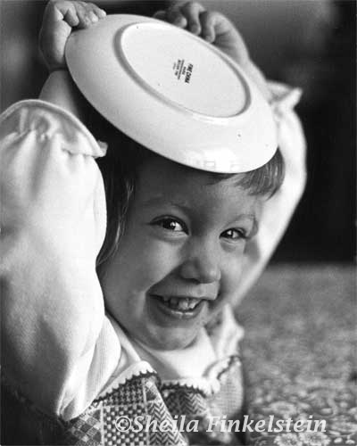 Heather, a cousin's daughter, joyfully playing and communicating with family members around a table.